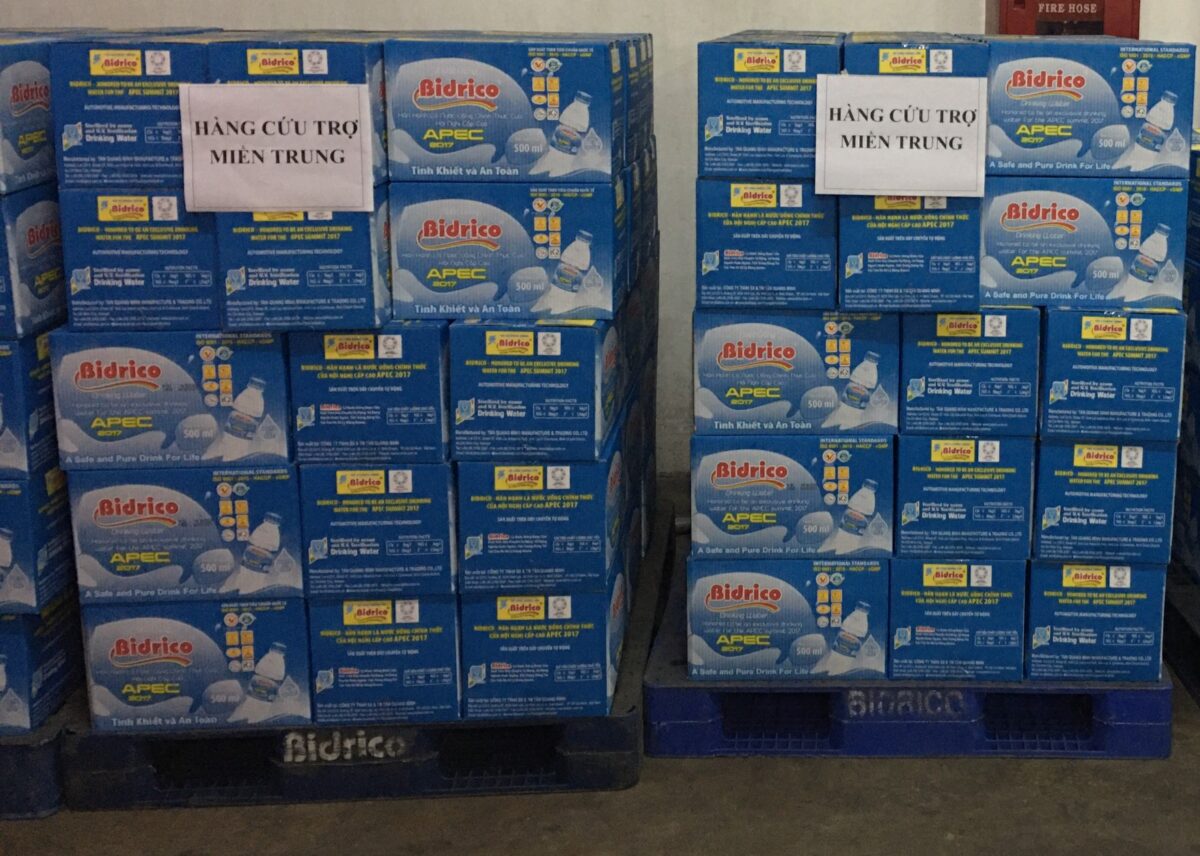 Công ty TNHH SX&TM Tân Quang Minh – Bidrico đồng hành với các hiệp hội Doanh nghiệp TP.HCM, FFA và một số hiệp hội khác đóng góp chi phí và 12.000 chai nước tinh khiết 500ml cho bà con các tỉnh miền Trung, chia sẻ những khó khăn mà họ phải gánh chịu trong đợt bão lũ này.