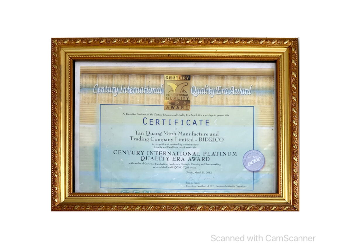 CÔNG TY BIDRICO (TÂN QUANG MINH) ĐƯỢC TRAO TẶNG GIẢI THƯỞNG “BẠCH KIM – CHẤT LƯỢNG KỶ NGUYÊN QUỐC TẾ CỦA THẾ KỶ” (CENTURY INTERNATIONAL PLATINUM QUALITY ERA AWARD).