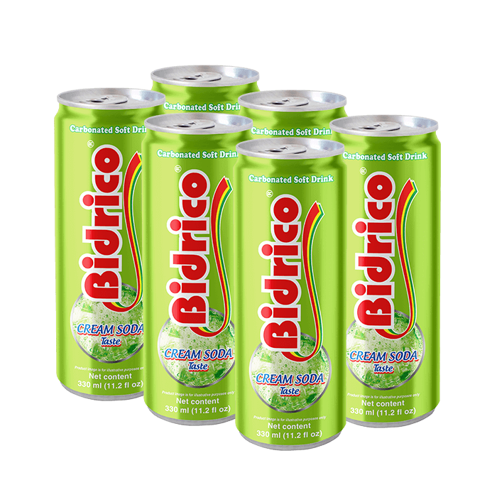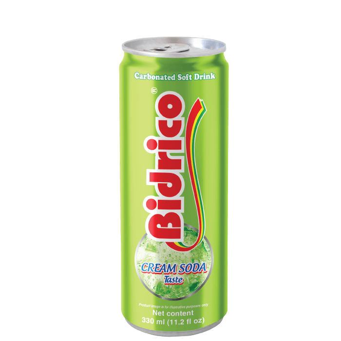Other Bidrico carbonated soft drinks 330ml can: Orange, cream soda, cola, sarsi.